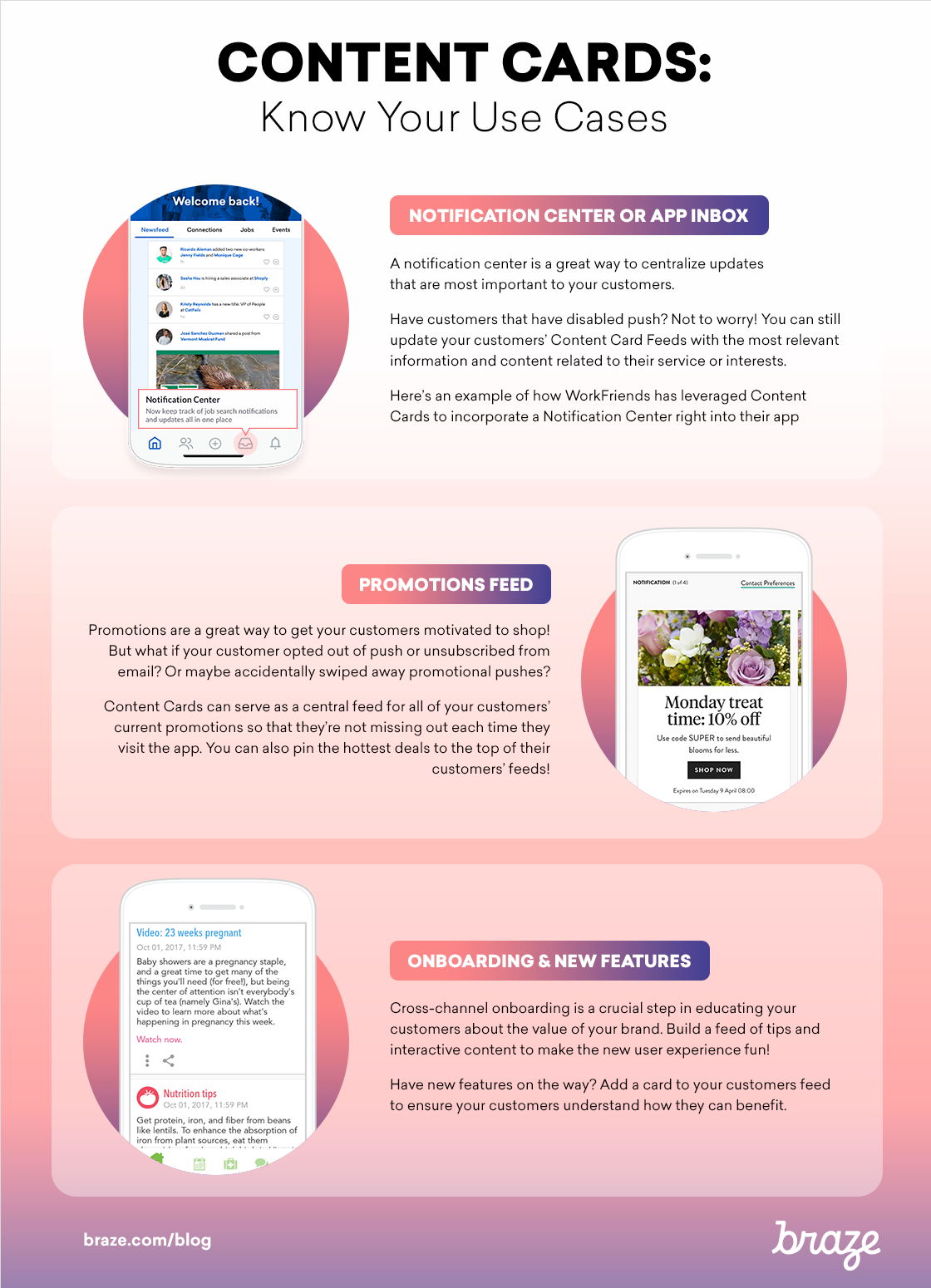 Content Cards can be a great way to tie all of these channels together. For retail brands, they can send a push to alert of a promotion. Maybe the customer hasn’t seen it—or hasn’t had time to go into the app. Send an email to highlight the promotion again. What if customers have unsubscribed or haven’t gone through their inbox yet? If your customers are back in the app experience, show them a card in their promotions feed to alert and highlight key details about the promotion.