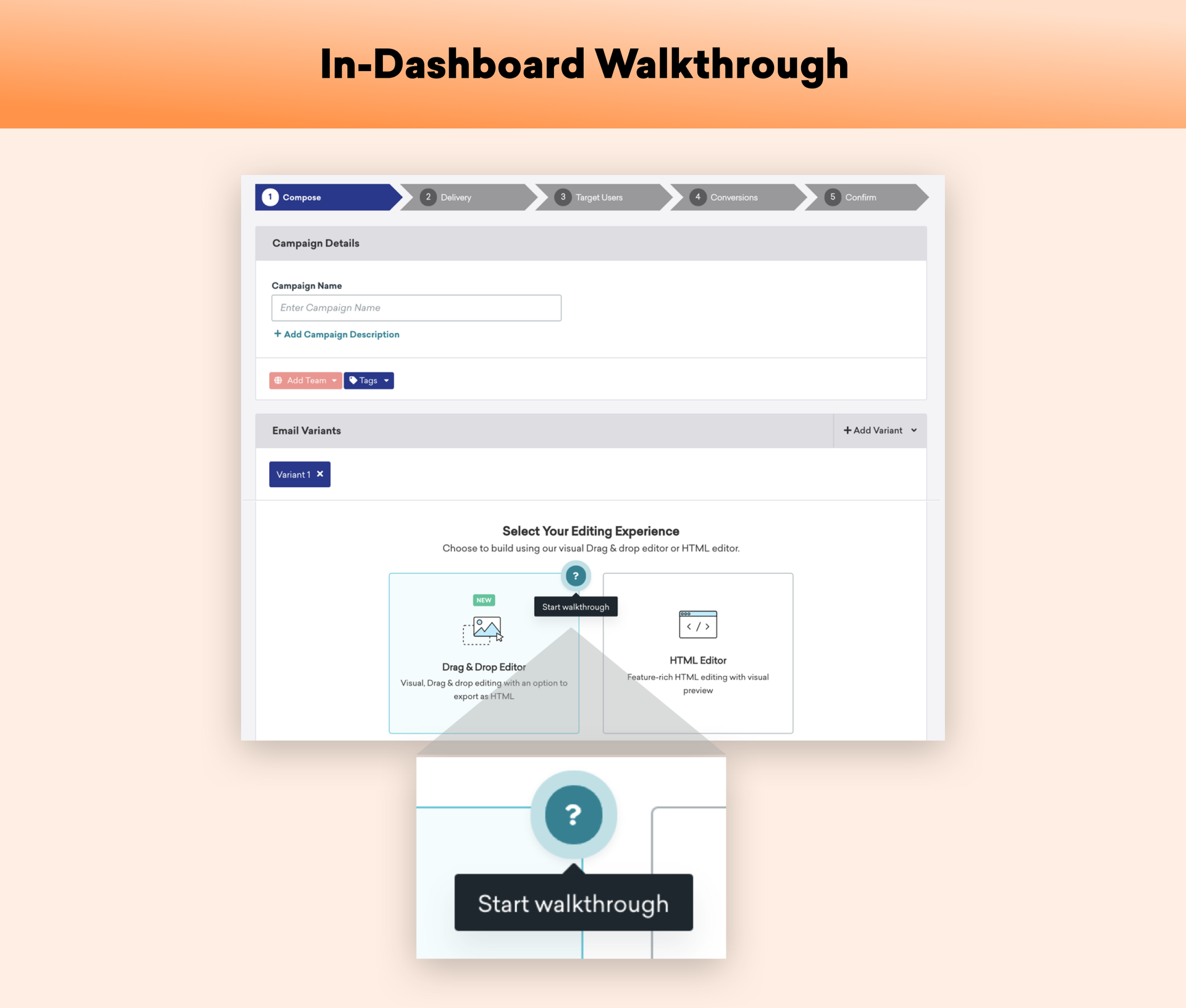 • Get Marketers Up to Speed Faster With In-Dashboard Walkthroughs. To help you get comfortable with our dashboard more quickly and efficiently, we’re launching new Braze in-dashboard walkthroughts across various areas of the platform. These intuitive, in-dashboard prompts guide users as they learn how to carry out key steps, driving a swifter, deeper understanding of how to make the most of Braze. (Want to try one out? Just quick on the question mark prompt when starting a new drag and drop email campaign to see our first walkthrough!)
