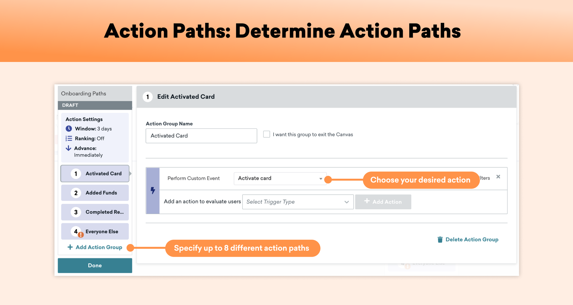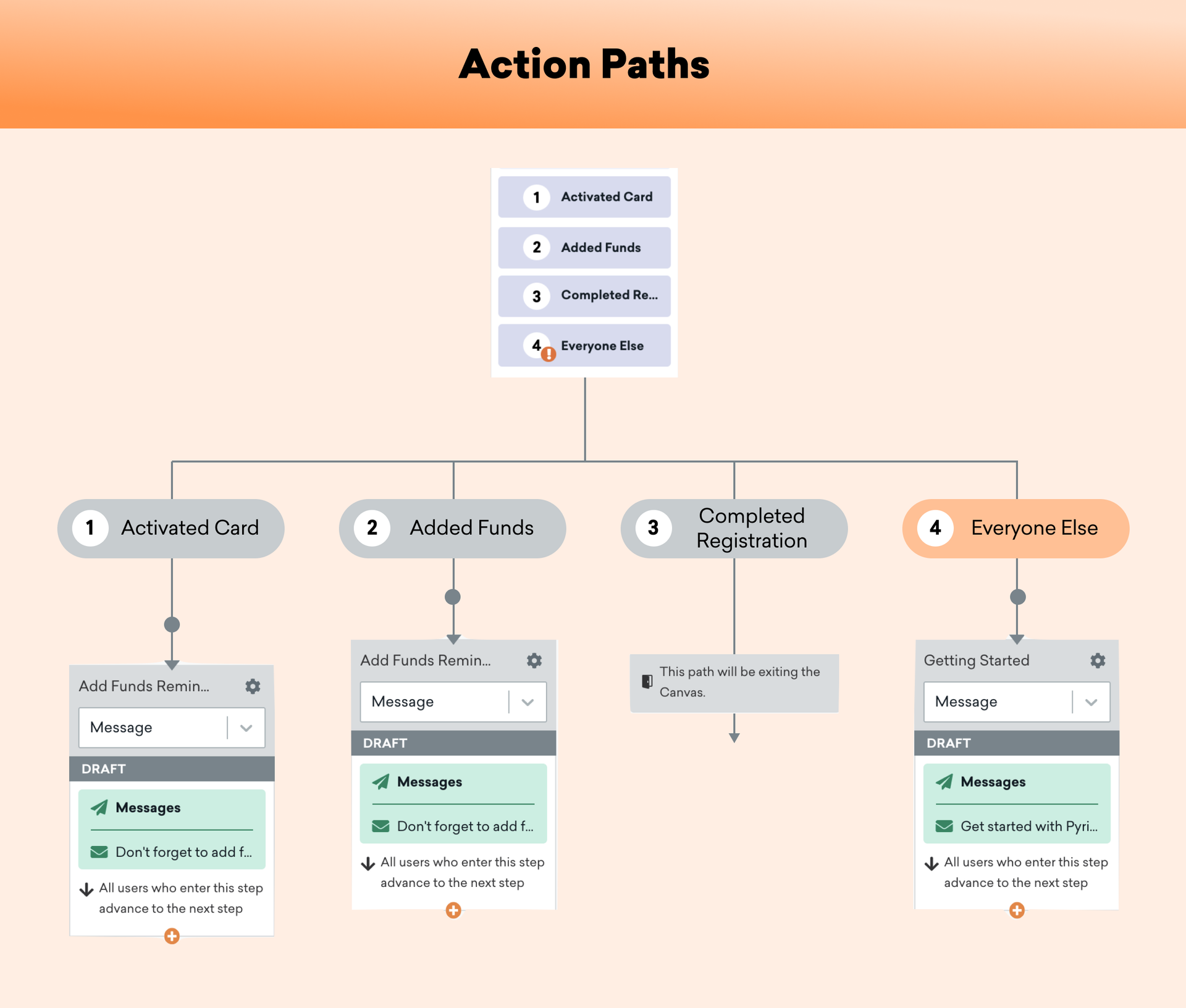 • Serve Up More Responsive Journeys With Canvas Action Paths. Today’s consumers expect individually relevant, meaningful experiences from the brands they engage with. To help brands make that vision a reality, Braze is proud to introduce Canvas Action Paths. This new Canvas component makes it possible for marketers to sort their users into different journey paths based on the specific actions they take (or don’t take) during a given timeframe, supporting more relevant, impactful messaging step by step and experience by experience. For instance, a payments app could use action steps to build a single onboarding journey that provides custom responses depending on whether a given user completed their app registration, activated their debit card, added funds to their account, or did nothing at all, supporting a more personalized experience without adding complexity.