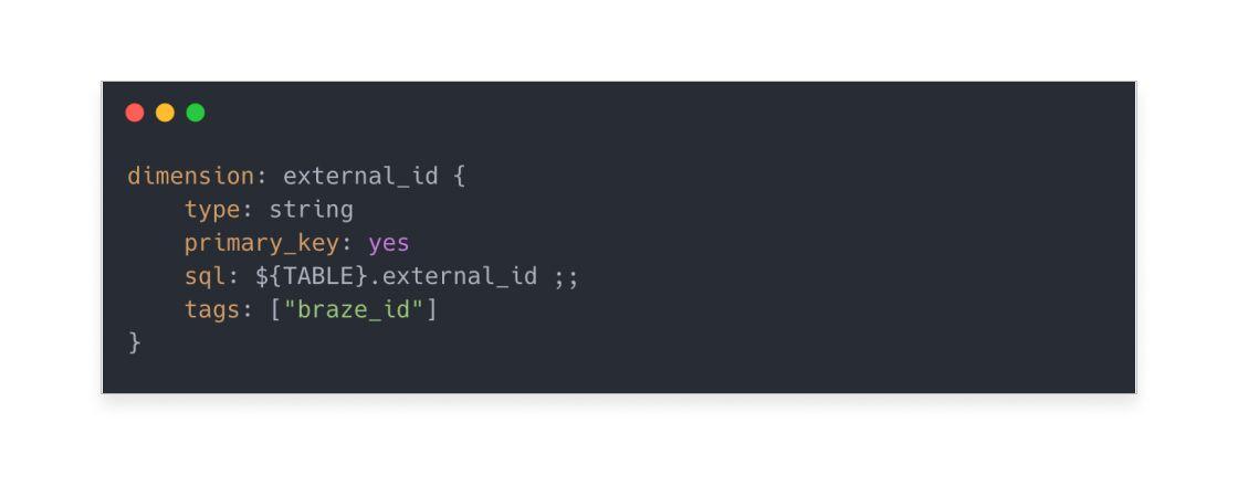 After that, you need to make sure that the unique user identifier you’re using—most often “external_id”—is tagged with “braze_id” in your LookML code in every Looker View you want to send to Braze: