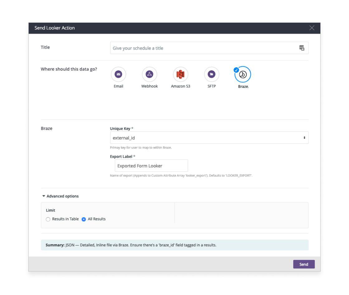 Imagine that you have a cohort of users within Looker who have bought one of your products that you want to use for segmentation purposes. Traditionally, taking that action would involve sending a CSV with the data to your email or to a storage tool like Amazon S3 before sending it along to a customer engagement platform. With the launch of Looker Action Hub support, Braze is making it possible to identify data sets in Looker and send directly from Looker to Braze—enabling easier segmentation and decreasing time to action.
