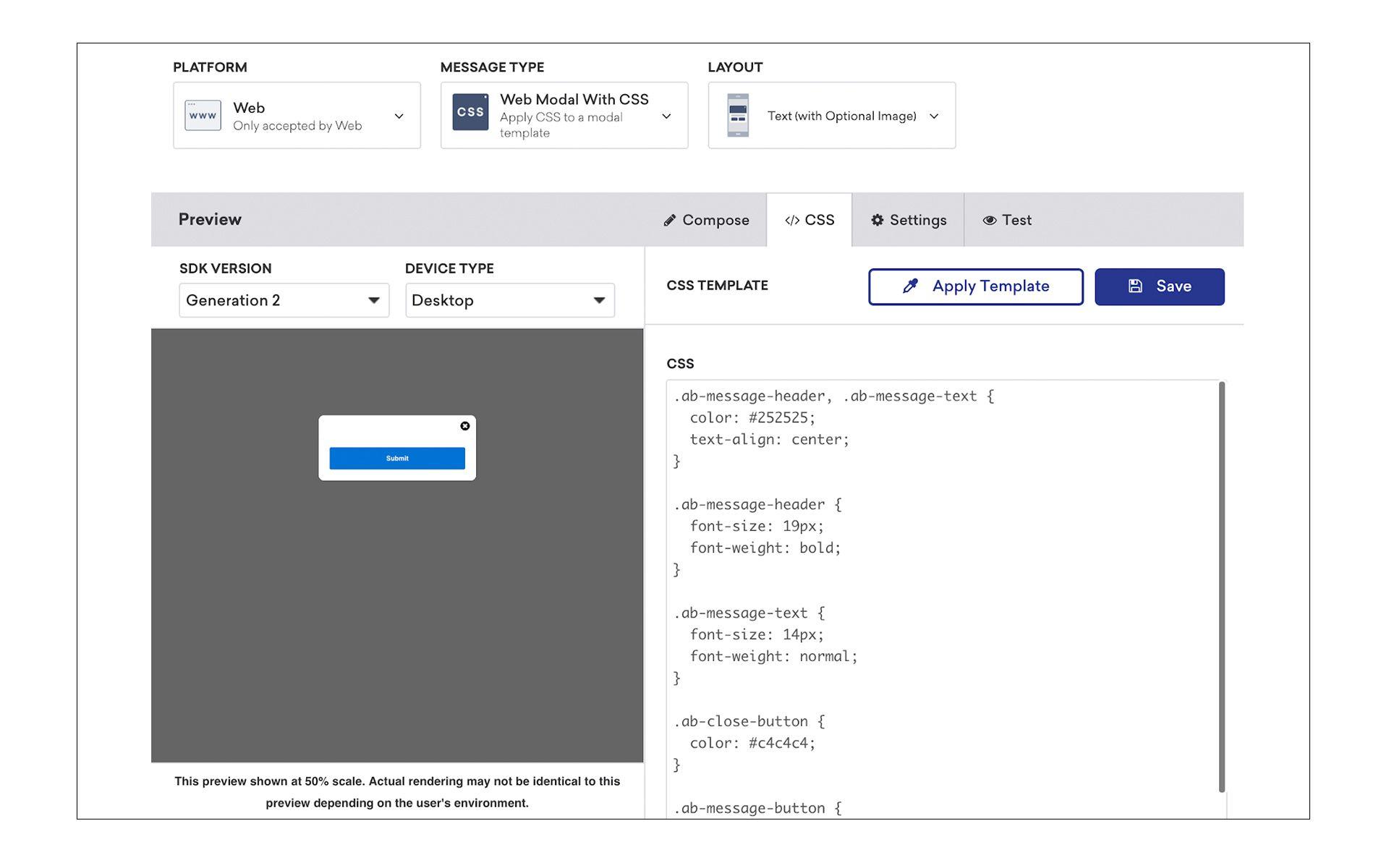 Consistency is one of the keys to delivering brilliant experiences. You can now ensure you’re providing consistent, visual brand experiences through the ability to customize in-browser messages with reusable CSS. Customize everything from fonts to kerning, and make your web messaging shine.
