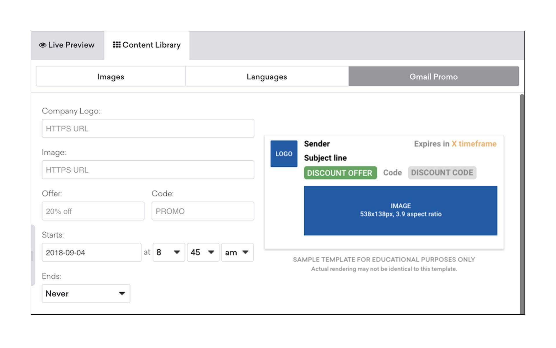 This update to allows companies to include promotional cards within the Gmail Promotions Tab, supporting richer, more appealing promotional email experiences with the Gmail inbox. By leveraging these cards, marketers can add context and interactivity by showcasing branded logos, discount codes, expiration dates, images, and other key content