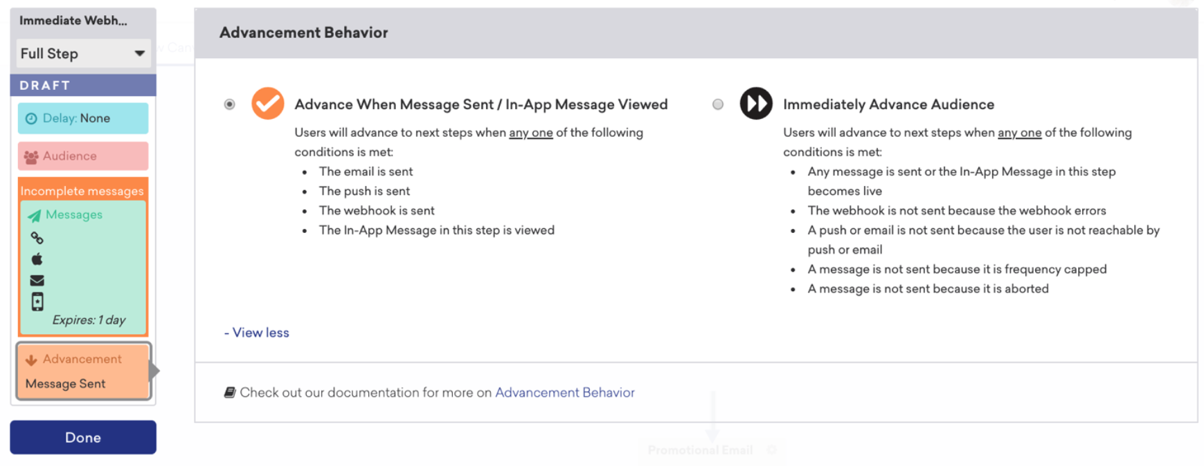 If you don't like the sound of that, you can use our "Advance When Message Sent" option, which would ensure that only users who were sent a message or viewed an in-app message are eligible to receive the next step in your journey. You'd use that option for sequential messaging that might not make sense if viewed out of order, for example.