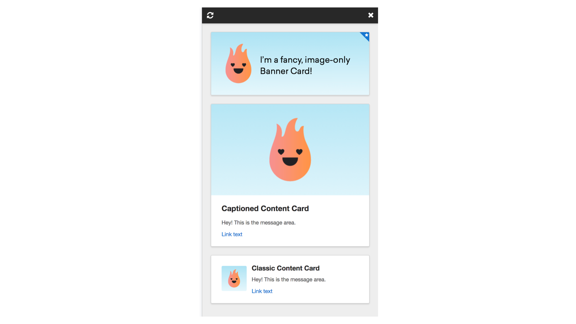 With Content Cards, you can send a highly targeted, dynamic stream of rich content to your customers right within your app or website, all without interrupting their experience. Or you can pair Content Cards with other channels, like email or push notifications, to enable cohesive marketing strategies. In addition, Content Cards give marketers and consumers alike more control over this channel by supporting card pinning, card dismissal, API-based delivery, custom card expiration times, and card analytics.
