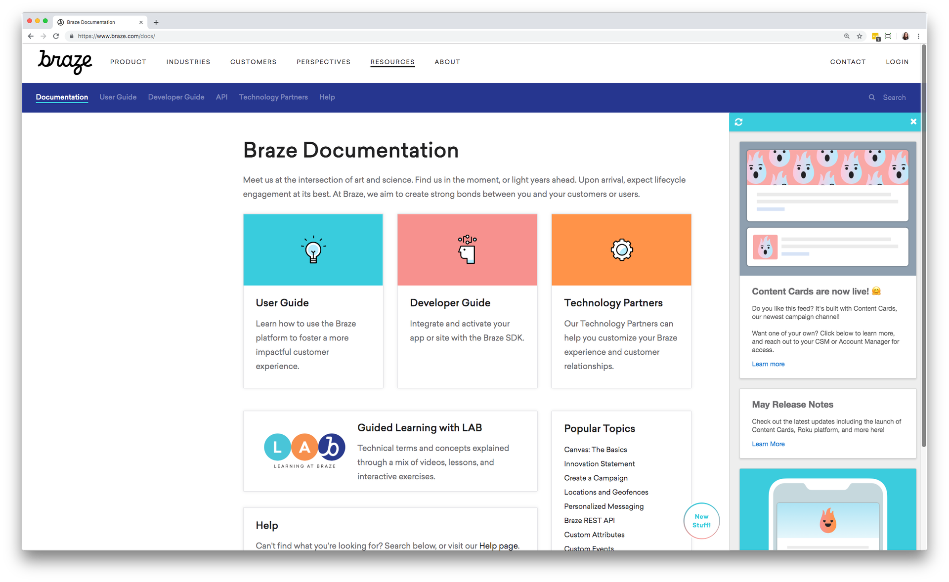 Our documentation site utilizes Content Cards to give our users easy access to and keep them up-to-date on the latest and greatest from Braze!