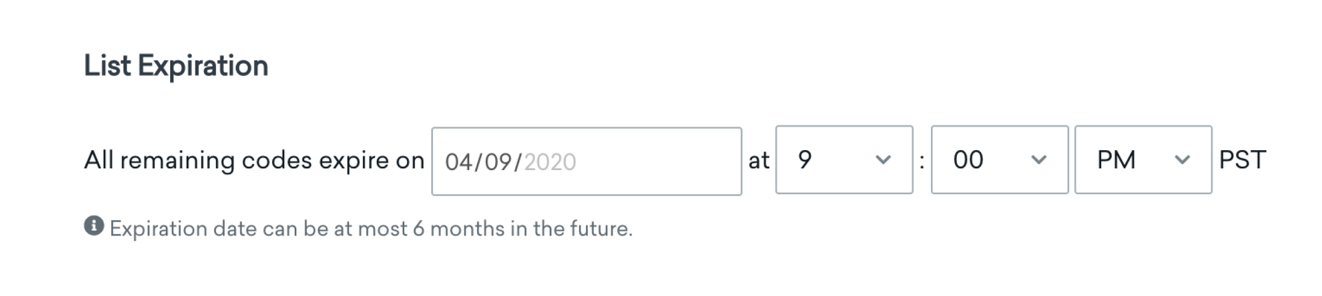 1. Expiration Dates: Set up an expiration date and time and rest easy knowing that you can edit them repeatedly as needed. Each Promotion Code List has a corresponding expiration date and time that gets set upon creation. This expiration date will apply to all codes added to this list. Upon expiration, the codes will be deleted from the Braze system and any messages calling that list’s code snippet will not be sent.