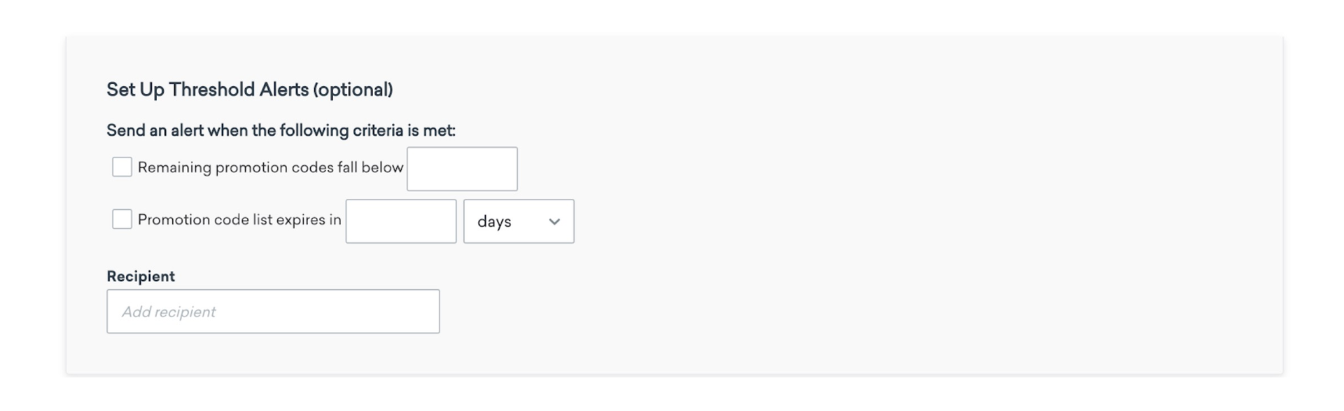 2. Threshold Alerts: Set up customizable threshold alerts to stay in the loop if you’re running low on available Promotion Codes in any list, or when your list is close to expiration. How does that play out in real life? Imagine you have a recurring winback campaign that runs once a month and is sent to any customer who hasn’t opened the app or visited your site in more than two weeks. That winback campaign references a Promotion Code List that you created and originally filled with 20 million codes. Since this campaign might run for more than a year, you set yourself a threshold alert of 1 million codes. So as soon as this list of codes falls below 1 million active codes, you’ll get an email. You can then decide to upload more codes, if needed.