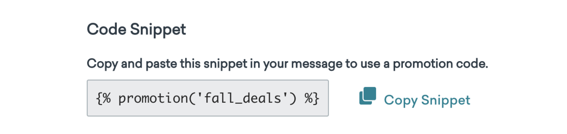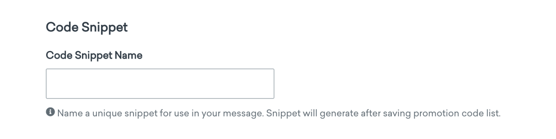 2. Create a “code snippet.” This is essentially a metadata code (similar to a personalization tag) that you will insert into a message body when you’re ready to share your promotion to your customers. This should be unique, but recognizable. If we’re sticking to our Mother’s Day theme, it might be something like “mothersday_2021_US.”