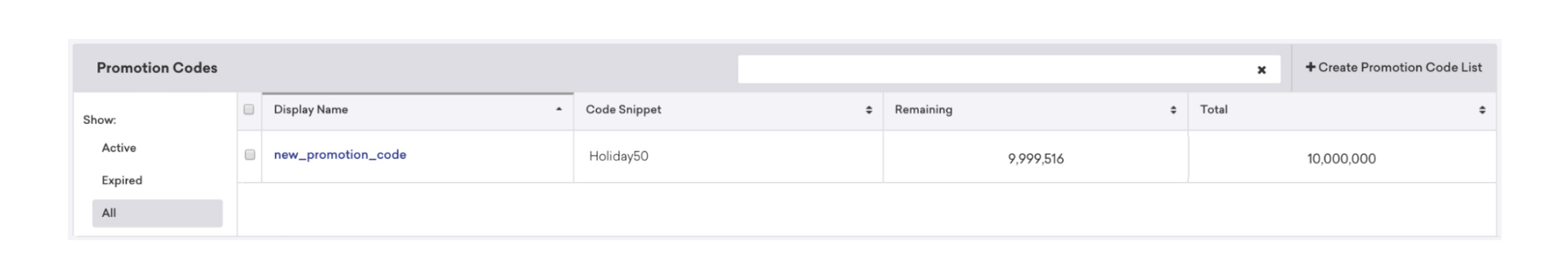 When the message containing a promotion code snippet gets sent to a recipient, the unique code will get marked as “sent” on the Braze backend, to ensure no code gets deployed to multiple users. So if you uploaded 1 million codes to start with, and your cross-channel campaign gets sent to 200,000 individual recipients, your list will mark 200,000 unique codes as “sent”, leaving 800,000 more active codes to use. You’ll be able to see how many active codes are available in your Promotion Code List directly in the Braze dashboard.