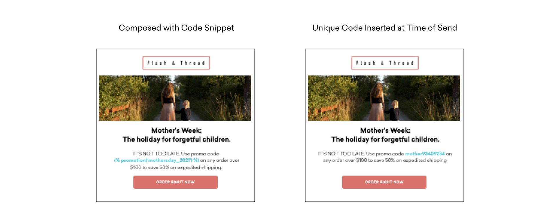 2. Next, navigate to the campaign or Canvas you’re building out to send this deal to your customers. Following along with our Mother’s Day theme, let’s say you’re sending an email and a push notification to a target audience of customers who filled out a survey and explicitly shared that they are moms. This survey was then passed back to Braze, and their mom status stored as a custom attribute within our platform. So now you’ve got your target audience and you’re building out your messages. You simply paste that code snippet wherever you want your unique code to show up within the message. Here’s what it looks like in composition vs. delivery.