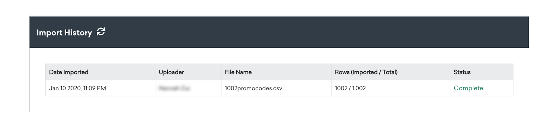 4. Once the list has finished uploading, click “Save.” Once you do that, you’ll see a new row appear in the Import History below. Since you can add more than one CSV file to your list over the course of the promotion’s lifecycle, this will help you track what was uploaded when and by who, supporting a more transparent understanding of your organization’s usage of the feature.