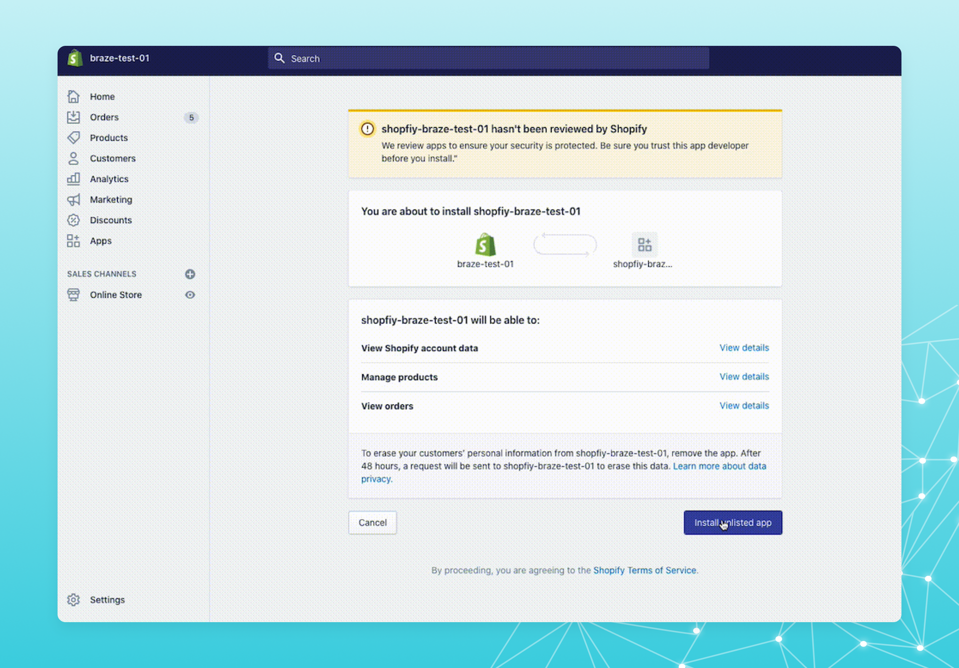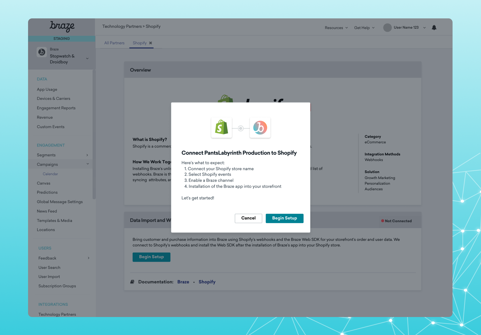 Best of all, the Braze/Shopify integration is marketer-friendly and easy to set up. All you need to do is locate Shopify within the Braze dashboard, install the Shopify application, and verify completion. No coding necessary!