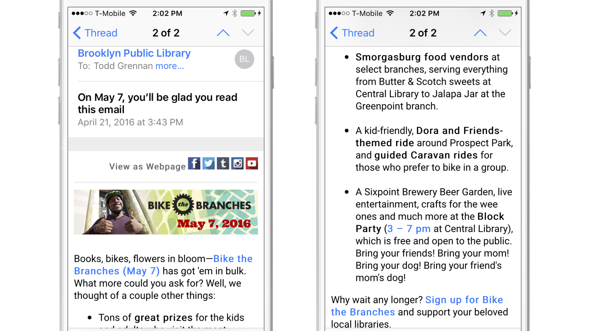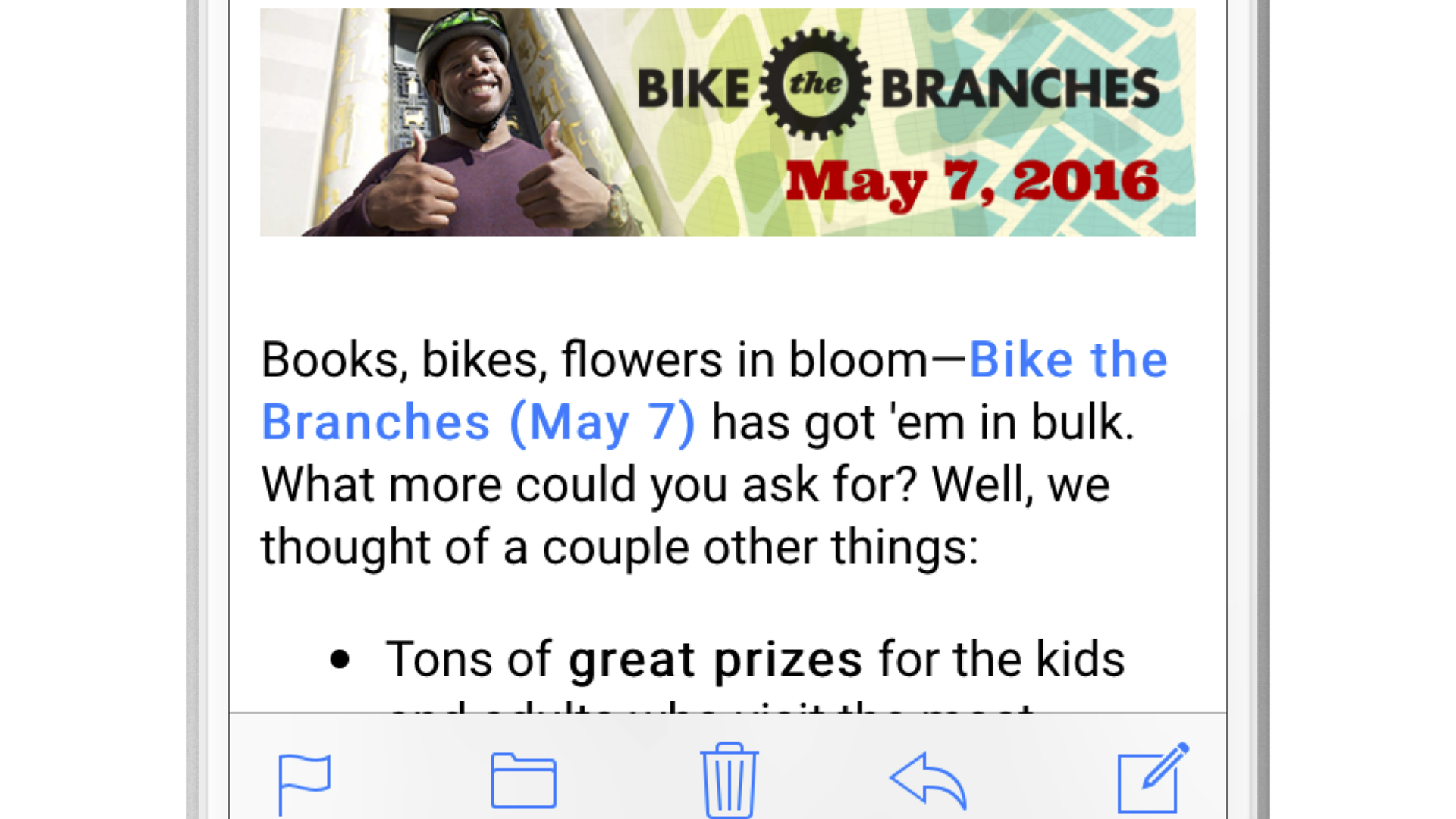When you open this email, you’re immediately greeted with an image that encapsulates the content of the message to come. A person wearing a bike helmet, to highlight the fact that the email is aimed at bicyclists. The Brooklyn Public Library’s iconic doors. The name of the event. The date it’s happening. And one very enthusiastic model.