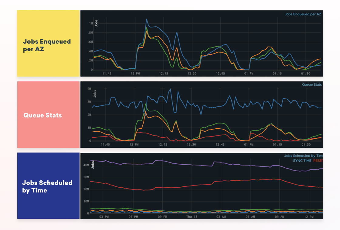 For each group and cluster, we collect a set of job queue metrics, such as the number of jobs enqueued per availability zone, latency stats, and how many jobs we are scheduled to process in the future.