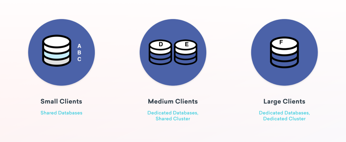 Braze deploys its databases for customers in three different models. Small clients go on shared databases. Medium-sized clients have their data stored on dedicated databases on shared servers. Our largest clients have their own dedicated databases on dedicated servers. This approach allows Braze to provision different sized databases on a per-customer basis, and move customers around as they grow.
