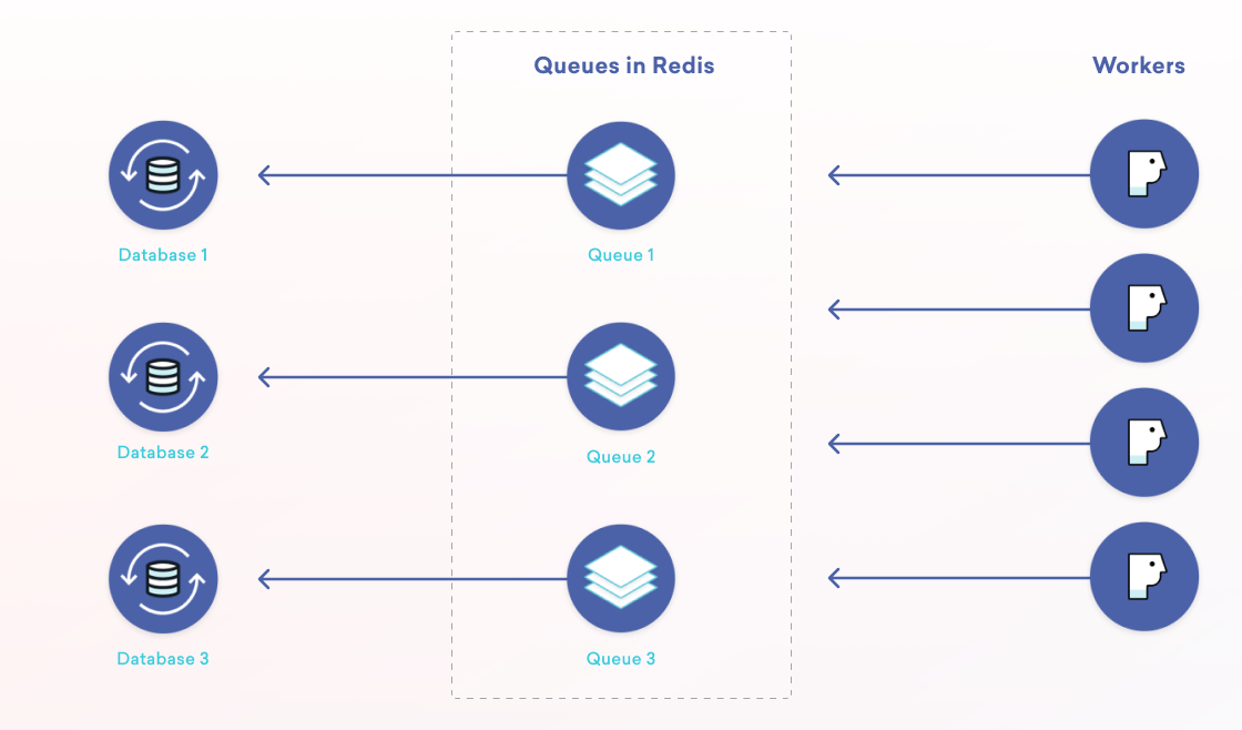 There are some great benefits to this. First, we get isolation for a particular customer which can help with security and compliance needs. Our queue deployment model also improves scalability by allowing us to increase throughput with the addition of more Redis databases, job queues, and application servers. There are other benefits as well worth checking out in our blog post on our queuing system.