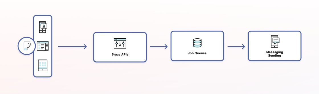 To start, there are two main categories for processing at Braze: Data processing and message sending. When our customers integrate with Braze, they typically install an SDK in their mobile applications or websites. Each time someone uses an app or visits a webpage that Braze is integrated with, our servers process data to learn more about the end user’s preferences and behaviors. Braze also ingests data from partners, such as Segment, mParticle, Amplitude, and AppsFlyer. Each of these pieces of data needs to be processed as quickly as possible because each data point can impact customer messaging—an action a user takes may cause a message to be sent or a scheduled message to be canceled. Data also tells us if a customer converts on a campaign goal, which could move the customer along in their life cycle.