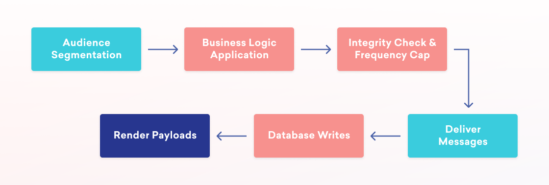 At a high level, to send a message we first determine the user audience. Then, some business logic runs to figure out who in that audience should receive a message. For example, let’s say we are sending an email but a given user in the audience has unsubscribed or does not have an email address. Or we’re sending a push notification to iOS users alerting them about an update, and a particular user in the audience is only an Android user. In that case, we’ll want to filter those users out. Next, we perform an integrity check on the resulting audience against any global frequency caps. To avoid sending too many messages to end users, Braze customers can configure rules such as “no more than three emails a week, and no more than one message of any type per day.” Once we know to whom Braze is going to send the Campaign, the message is rendered, the database state is updated, and the messages are sent out.