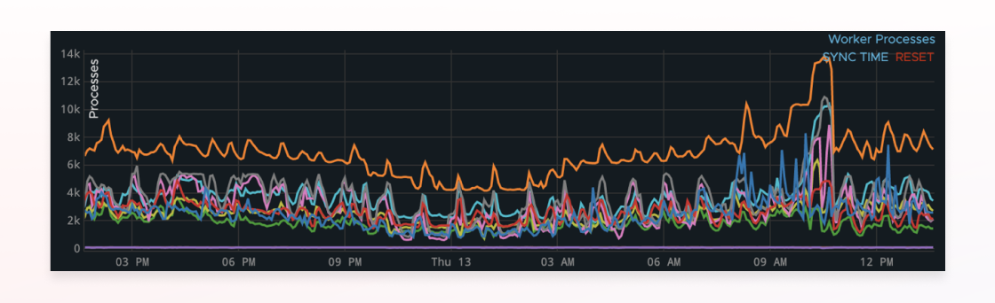 From there, Braze uses AWS Lambda to read the CloudWatch metrics about existing and future anticipated job queue state. This “asg-lambda” then does some math to figure out how many servers we need per database cluster and per availability zone then continuously spins up or scales down servers. The result is that throughout the day we’re constantly changing the different types of worker processes and servers that we have online.