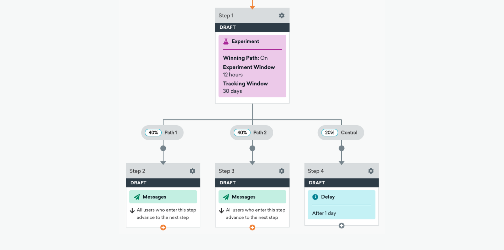 In particular, we were looking to help marketers do effective testing around the nuances of each customer journey. By building out experiment paths as a distinct step within Canvas, we made it possible for brands to more easily compare the impact of messages sent with different built-in delays, different cadences, different message copy, and various channel combinations and to adjust journeys based on those findings.