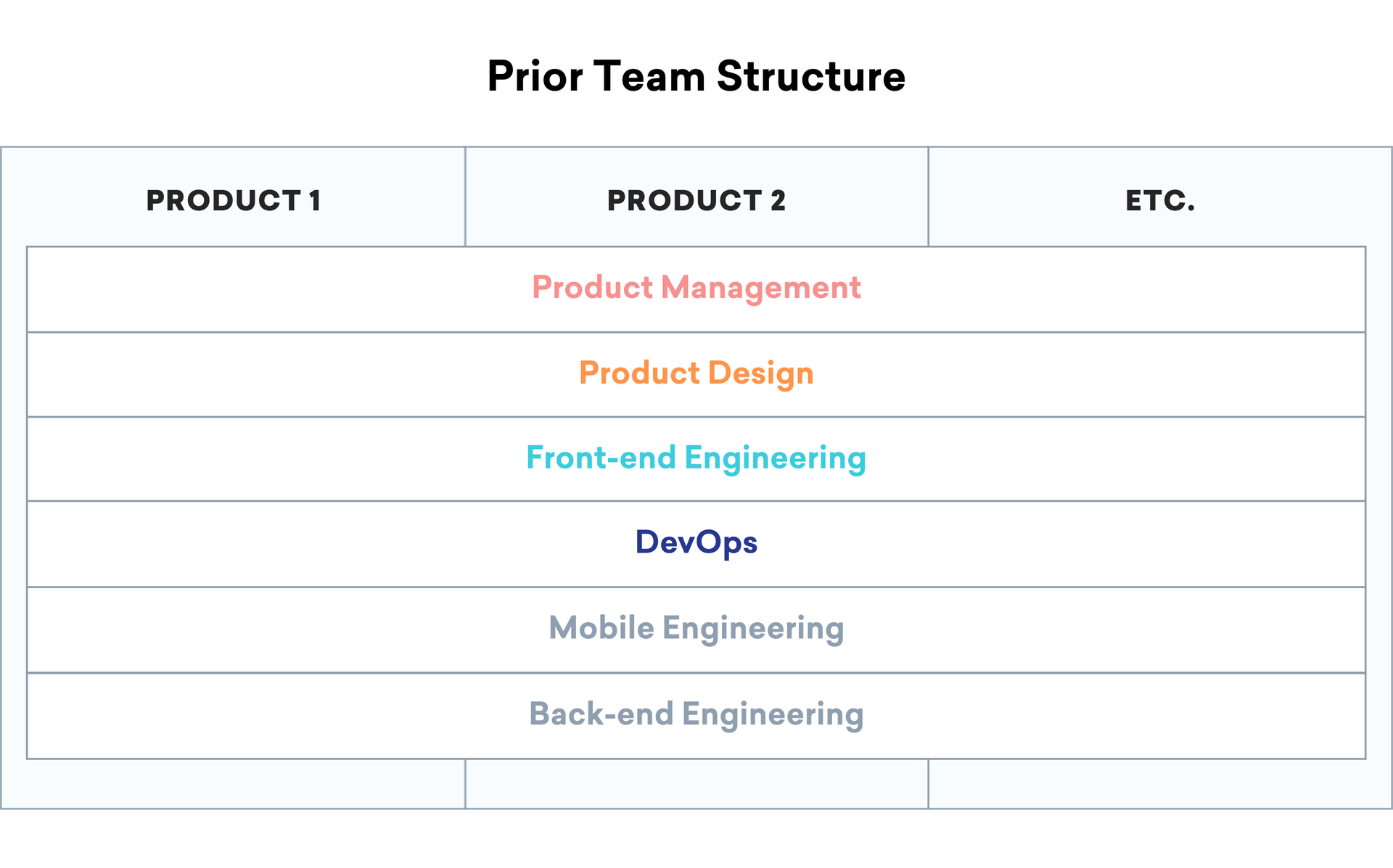 As our team grew past 30 or 40, however, this structure began to break down. We ultimately identified reorganization of our product team as a solution to some of our largest challenges. We were expending unsustainable effort juggling skill sets and timelines to compose teams for strategic projects. We also spent inordinate amounts of time on prioritization, and often found ourselves force-ranking all product priorities across the business since our technology-based team structure did not map directly to the most essential product needs. And finally, we had few opportunities for team members to develop deep experience with particular customer use-cases.