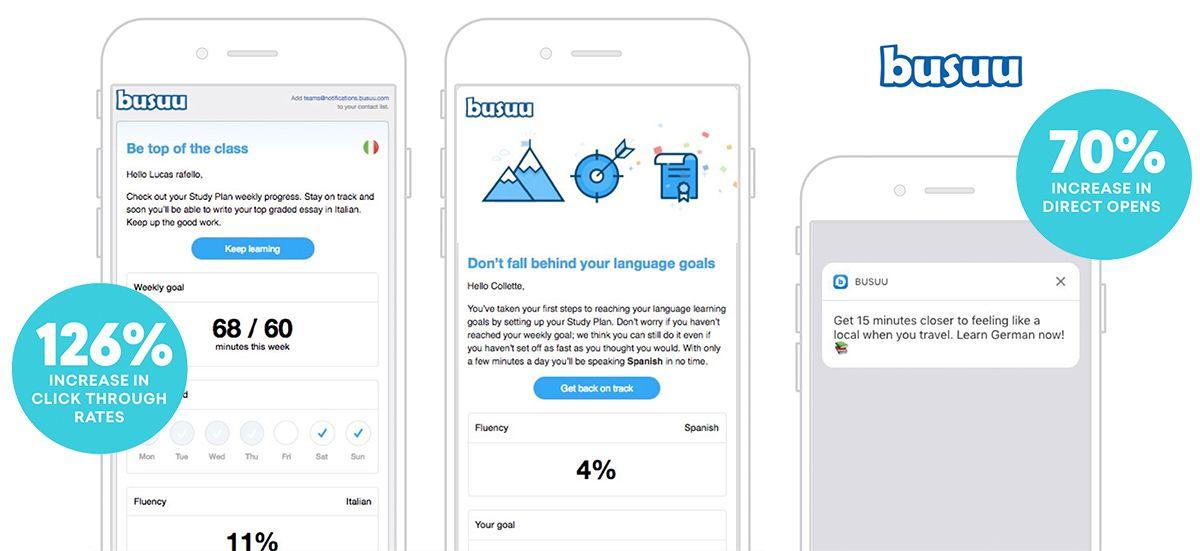 busuu decided they needed to send supportive, motivational messaging across email, push, and other channels that would help their users stay on top of their language learning goals. These highly-personalized, cross-channel messages would be gentle reminders for users to study, as well as to help them track their progress. The goal? busuu wanted to be more than just a learning tool; they wanted to be a supportive, helpful coach.