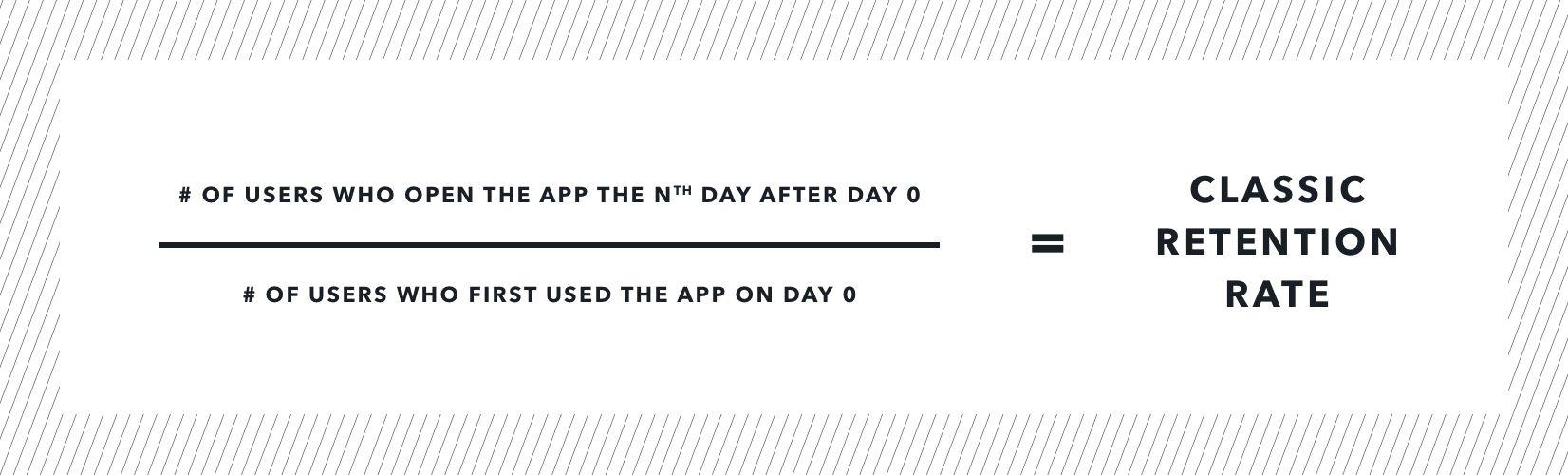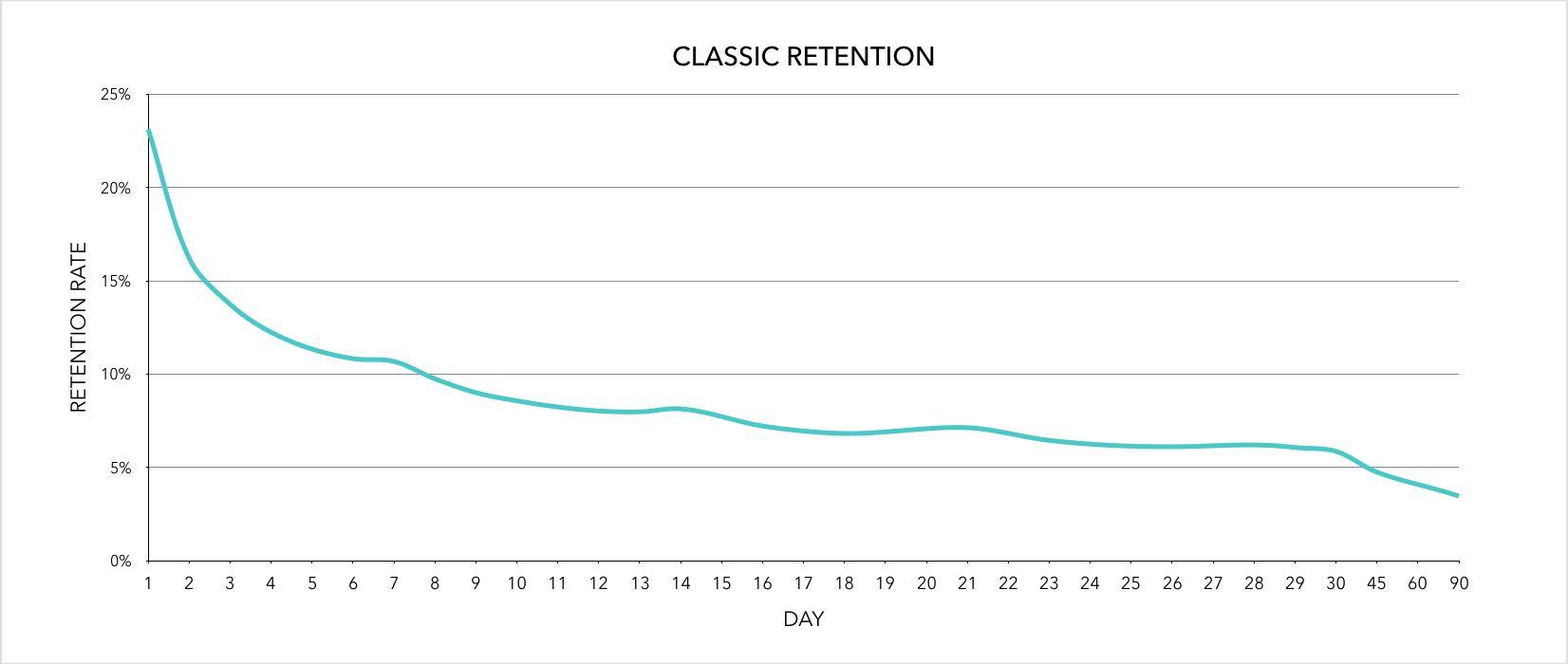 Classic retention, also known as Day N or Retention by Day, is the percent of new users who come back on a specific day.