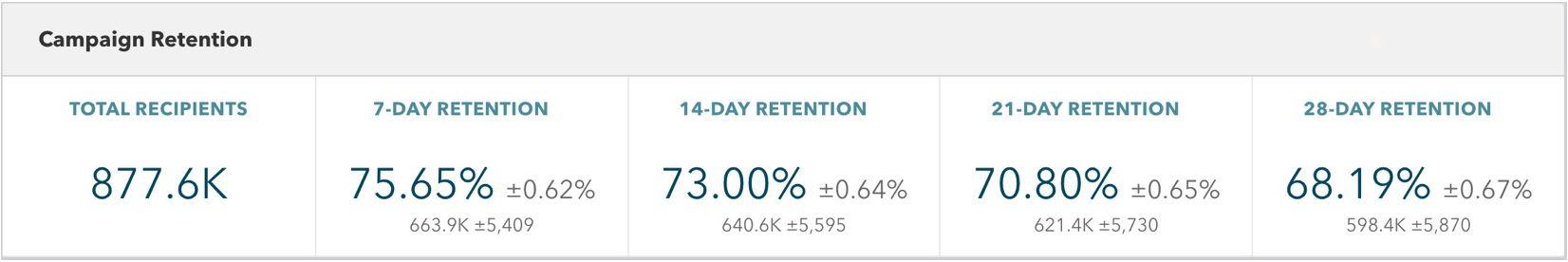 In the Braze platform, you’ll see weekly range retention automatically calculated, which is great for day-to-day monitoring of your overall marketing efforts. You can also use classic retention to identify inflection points in activity and messaging effectiveness, especially when used with complex, multichannel, multi-step onboarding campaigns. Averaging multiple days together also offers insights into user behavior either during the week or week over week.