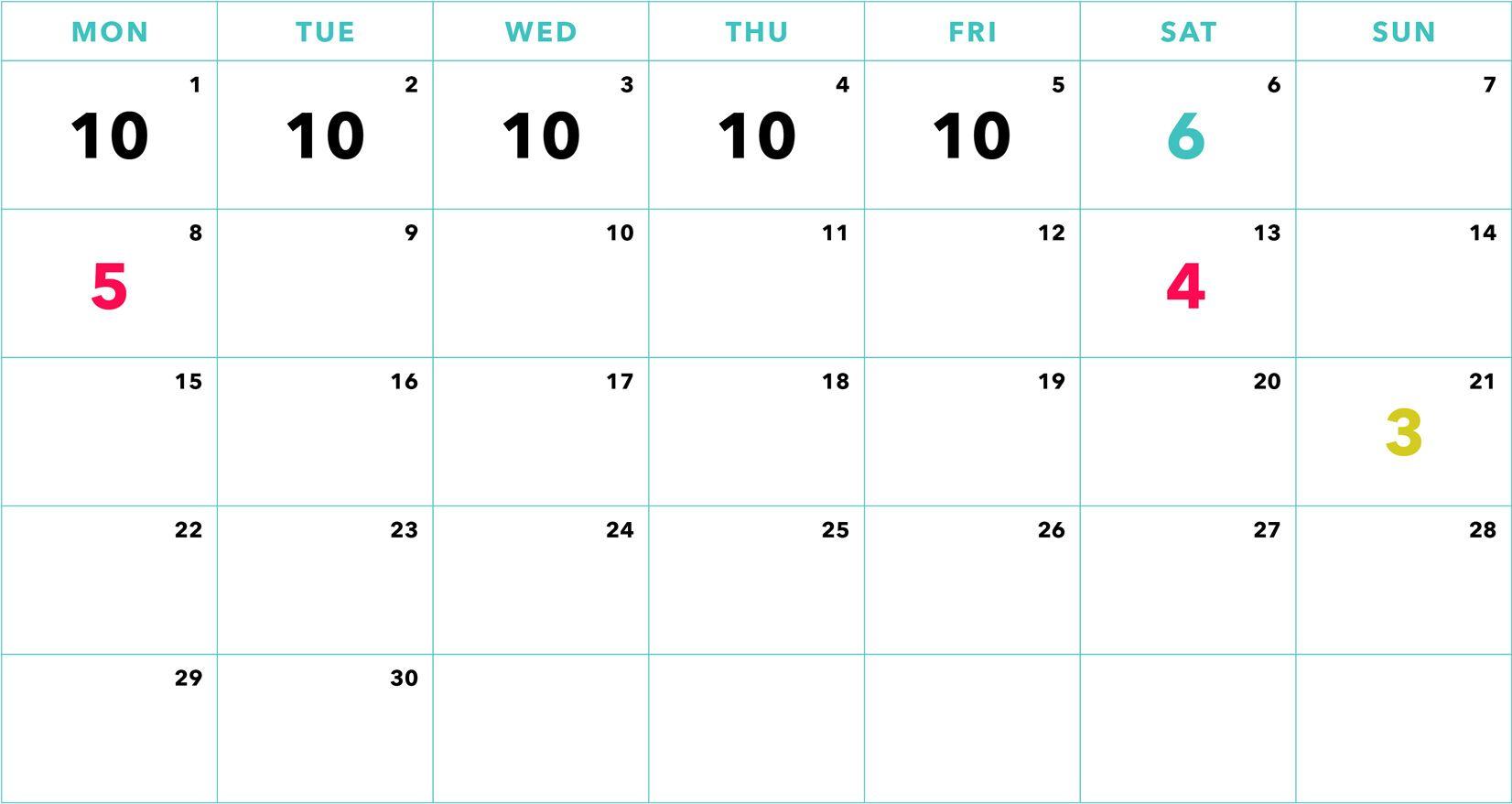 You have 10 new users every day for five days during the first week. On Saturday, the 6th of the month, six users come back. Some time during the subsequent week, nine unique users come back, five on the 8th and four on the 13th. In the third week, three users come back, all on the 21st. The first period retention is 9/50 or 18%. The second period retention is 3/50 or 6%.