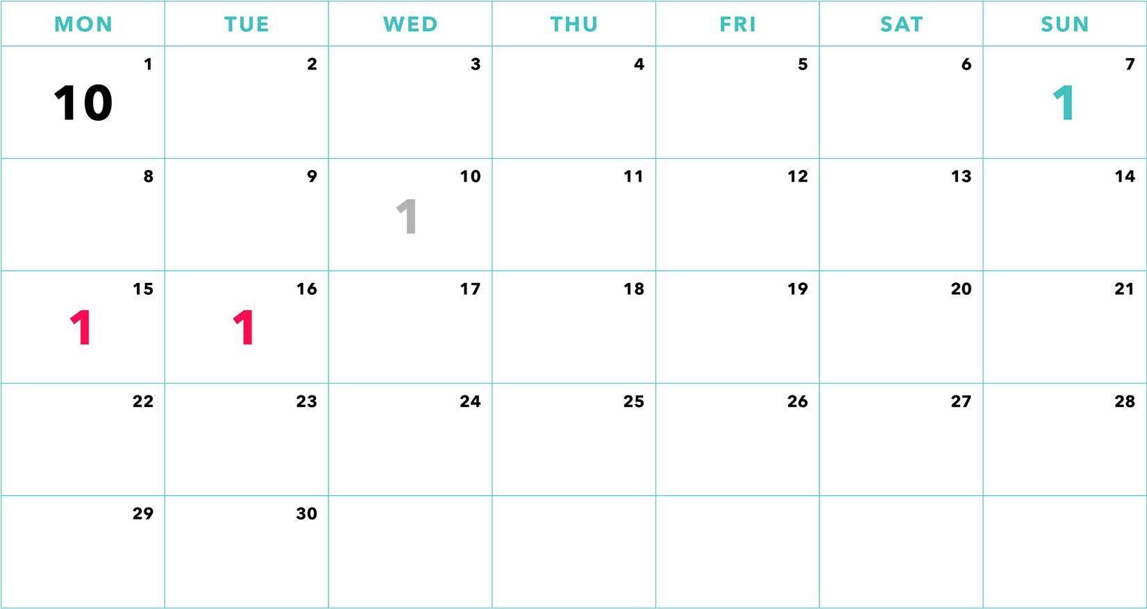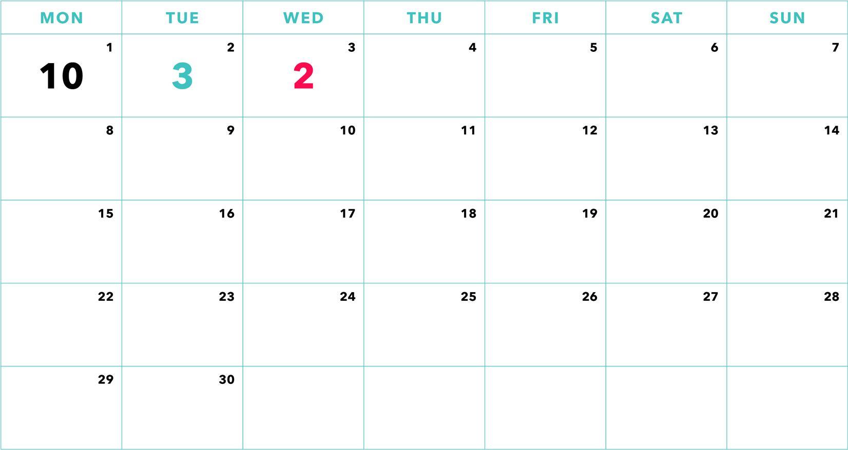 Imagine you have 10 users who first use your app on Monday, the first of the month. Three of those users come back the next day on Tuesday, the second of the month, and two come back the following day on Wednesday, the third of the month. Your Day 1 retention rate is 3/10 or 30%. Your Day 2 retention rate is 2/10 or 20%. If five people were to come back 89 days from Monday the 1st (not shown), your Day 90 retention rate would be 5/10 or 50%.