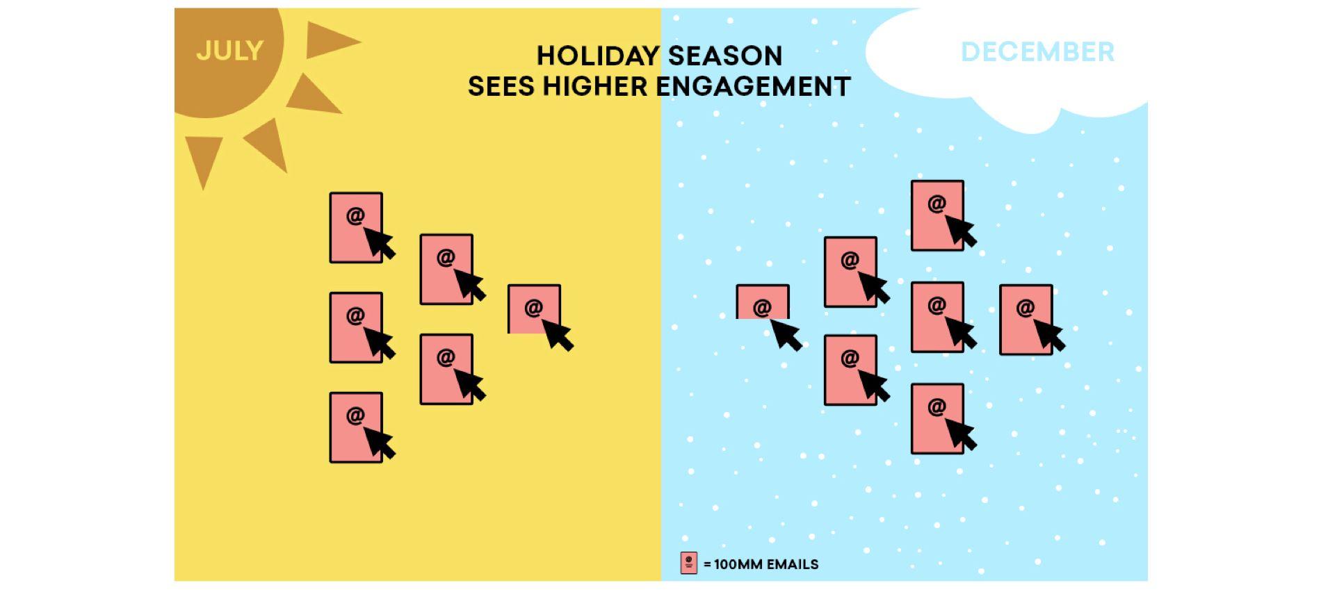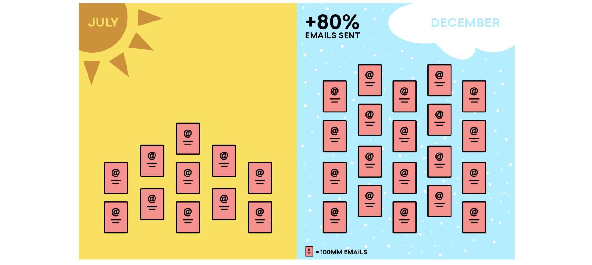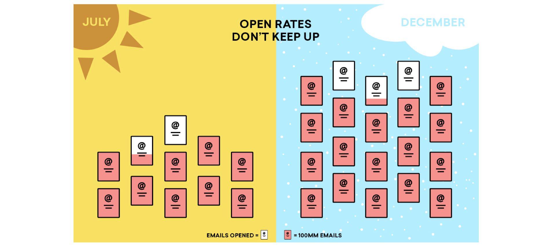 Let’s break this down a little. Since we’re sending emails by the billions, a fraction of a percent in open rates matters. So, effectively, for a volume increase of about 900 million emails, brands only saw about 120 million more opens in December than in July. There’s an effort vs. impact issue here.