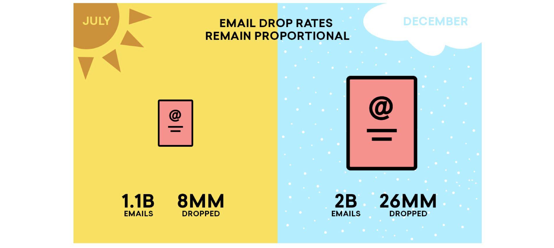 Email drop rates refer to emails that are sent to customers/email addresses that don’t qualify to receive your email. We’re sending about 80% more emails in December than July, and email drop rates for December are about 80% higher than in July. Makes sense. Now, why are we citing a statistic that effectively says “this number stays the same”? Because it represents an opportunity. If you challenge yourself to raise your drop rate in the months leading up to the holiday season, you can reap the rewards when the snow starts to fall.