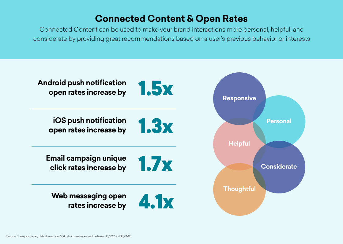 Content that's designed to make your brand interactions more personal, helpful, and considerate sounds like it should resonate, but how much of a difference does it make when it comes to key metrics, like open rates? We wanted to dig in and learn more, so we conducted an analysis of over 500 billion messages created using the Braze customer engagement lifecycle platform. Here's what we found out about just how the tool has an impact on consumer behavior, broken out by channel. Based on our research, brands that utilize Connected Content see: