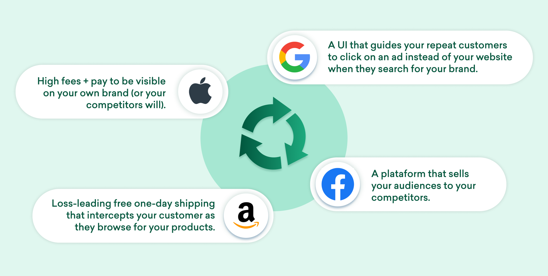 The design of Facebook's platform means that many companies are effectively selling their audiences to their competitors, while Google's dominance often means that brands have to pay to reach users who might otherwise find their website organically, at no charge to the company. Amazon and Apple have their own downsides, forcing marketers to make compromises that may result in new users, but at what cost to sustainable growth?