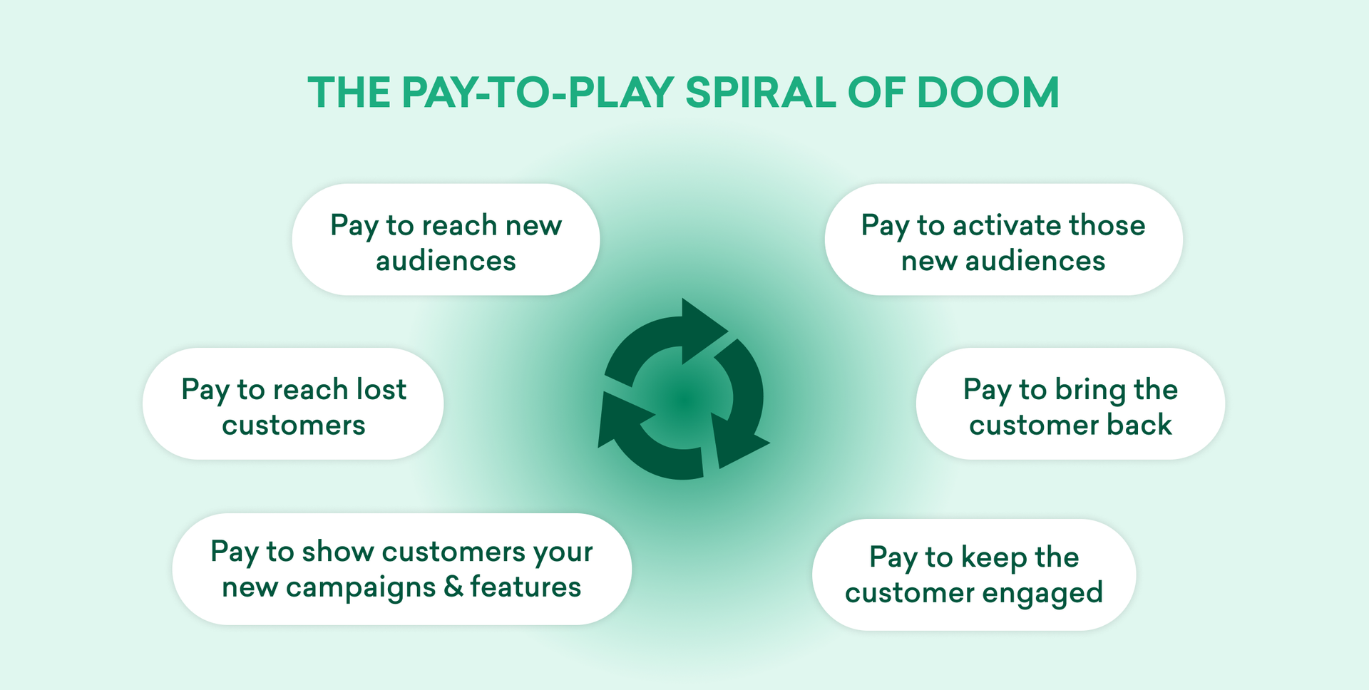 It's far easier and cheaper to engage and retain existing customers than it is to keep acquiring new ones (or to try and win back customers who have already churned). In fact, researchers have calculated the value of retention, finding that when brands are able to retain as little as 5% more of their customers, they can reap the benefits of 25% to 95% gains in profits. Still, many businesses lack a customer engagement strategy—or have inefficient ones in place to retain newly acquired customers. As a result, a large proportion of companies’ acquisition efforts go to waste and brands find themselves stuck in an endless loop of paying to play.