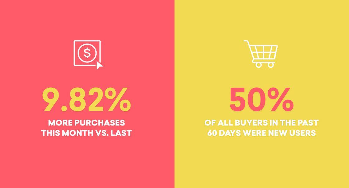 Money talks, even in a crisis. And while marketing teams have a lot on their minds today, they’re very aware that navigating their current challenges successfully requires them to keep the lights on when it comes to revenue. Thankfully, our research found that the uptick in new users during the COVID-19 era isn’t the only positive news for brands—in fact, our data found that purchases rose nearly 10% this month over last. That’s an encouraging sign, especially when you consider that purchases during that same period last year actually dropped month over month.