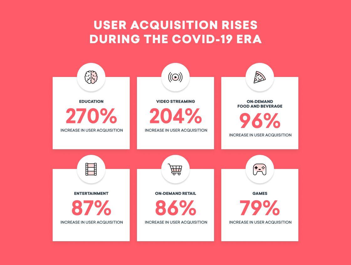 Since COVID-19 first struck, one big trend has stuck out: Brands are seeing huge influxes of new users. According to our research, year-to-date user acquisition peaked during the week of March 23, with 75+% more new users coming in that week than during the first week of January. This wave of new users has leveled off a little since then, but there’s no question that the impact of COVID-10 on user acquisition was huge, especially in key verticals: