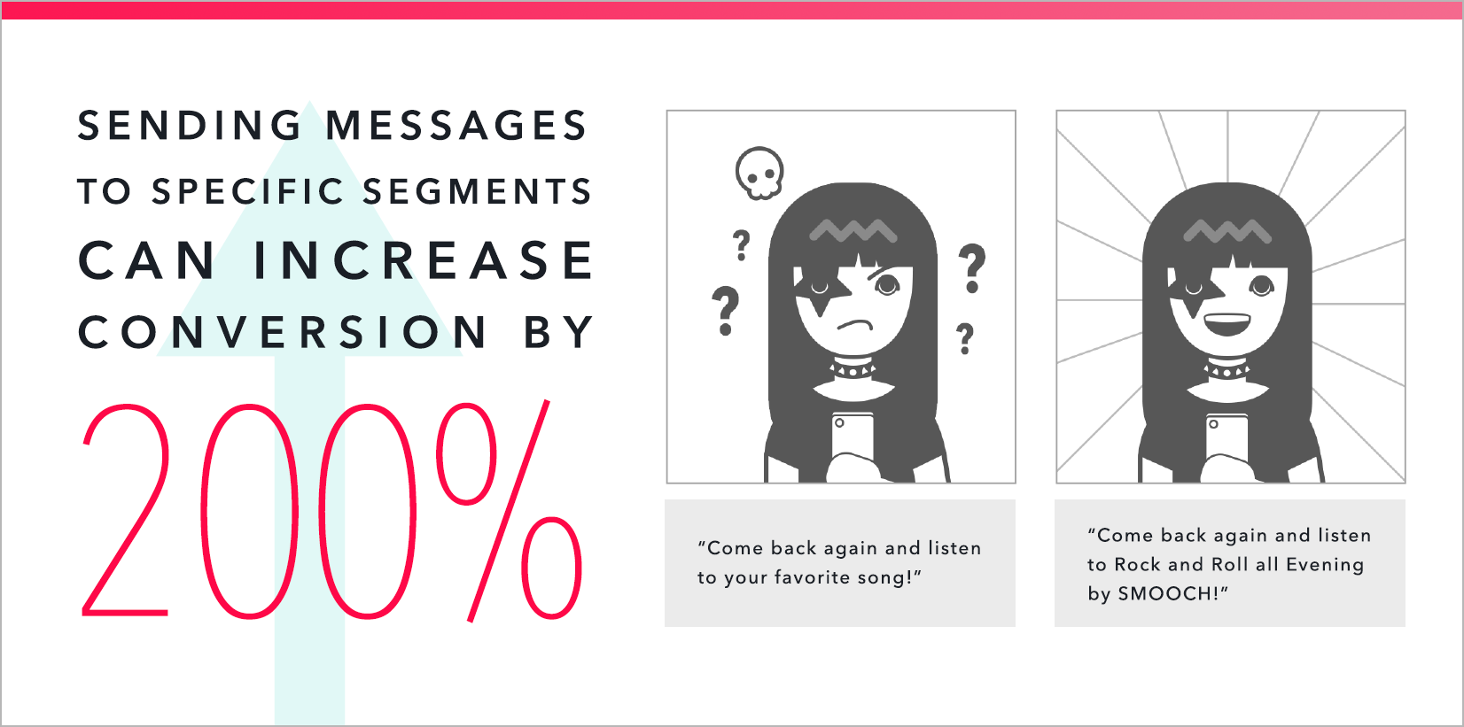 Your customer segmentation strategy is key for relevant and effective mobile marketing. Sending campaigns to smaller, thoughtfully constructed segments (vs. non-targeted blasts) can increase conversion by 200%.