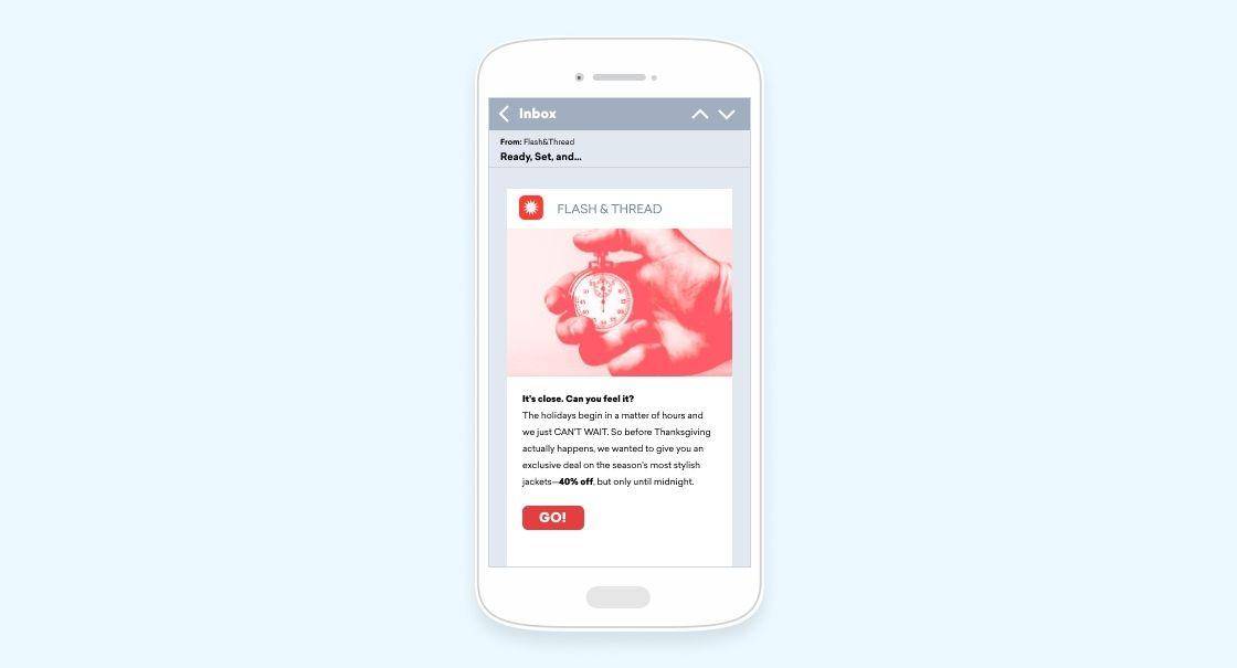 One smart way to approach this goal during the holidays is by choosing copy and creative that projects a sense of urgency. Think attention-grabbing headlines that mention gifts, savings, shipping deadlines, limited availability, and other signals that they need to engage with what you’re saying now. Great words to use include discount, savings, free shipping, limited time, today only or exclusive. Launch a campaign to alert users when an item that they’ve saved has low inventory.