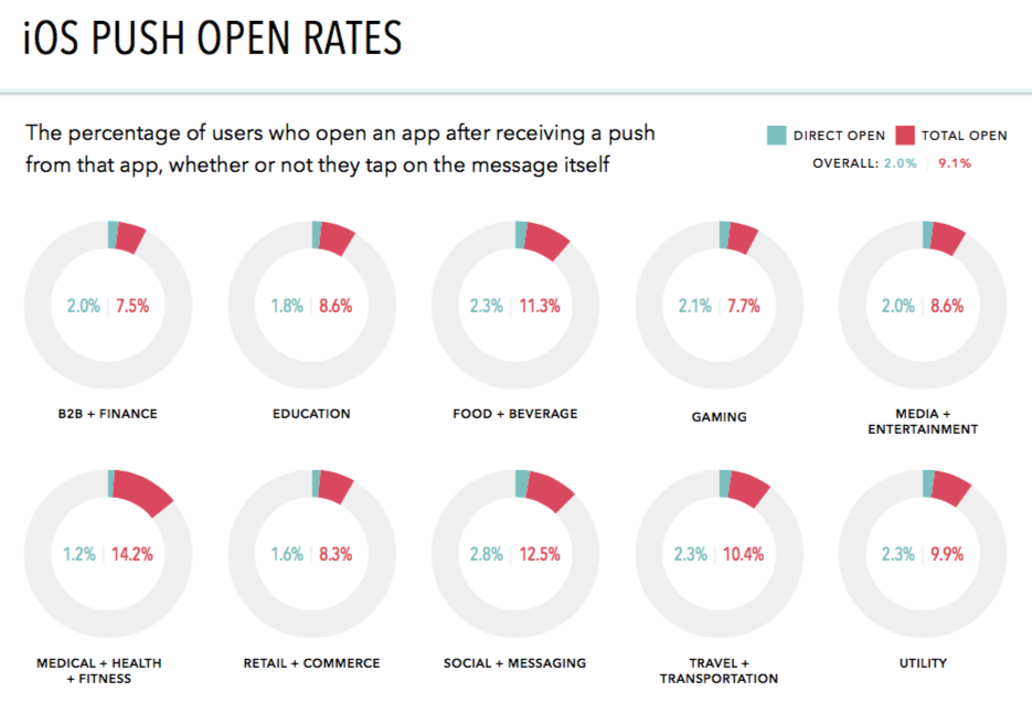 When you look at total opens (that is, direct and influenced opens) for iOS push notifications, the rate increases by 355%, demonstrating the real impact of sending push notifications on iOS.