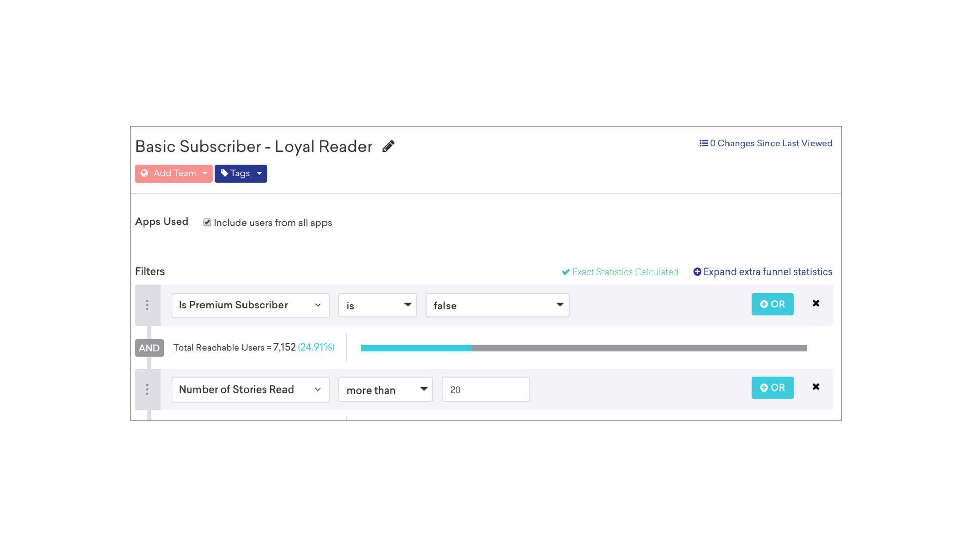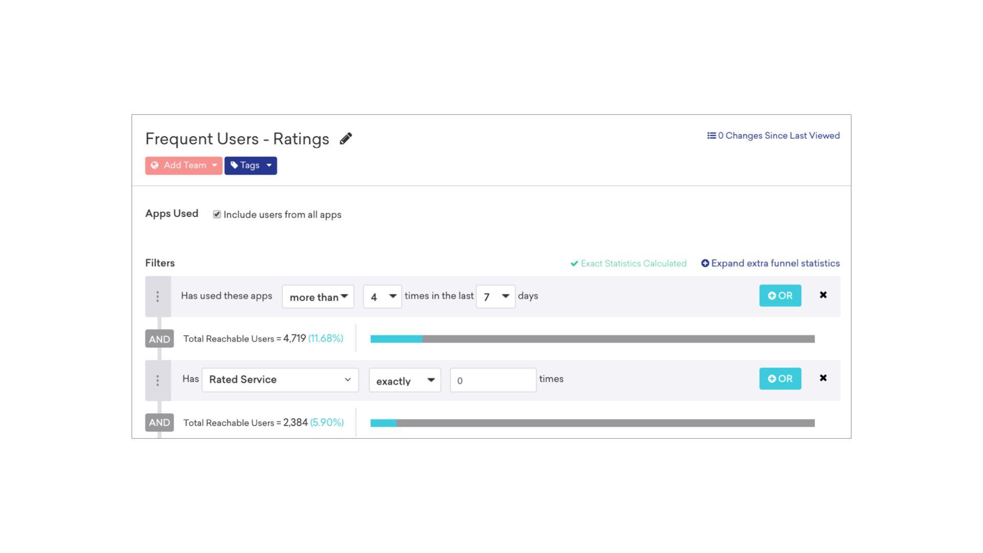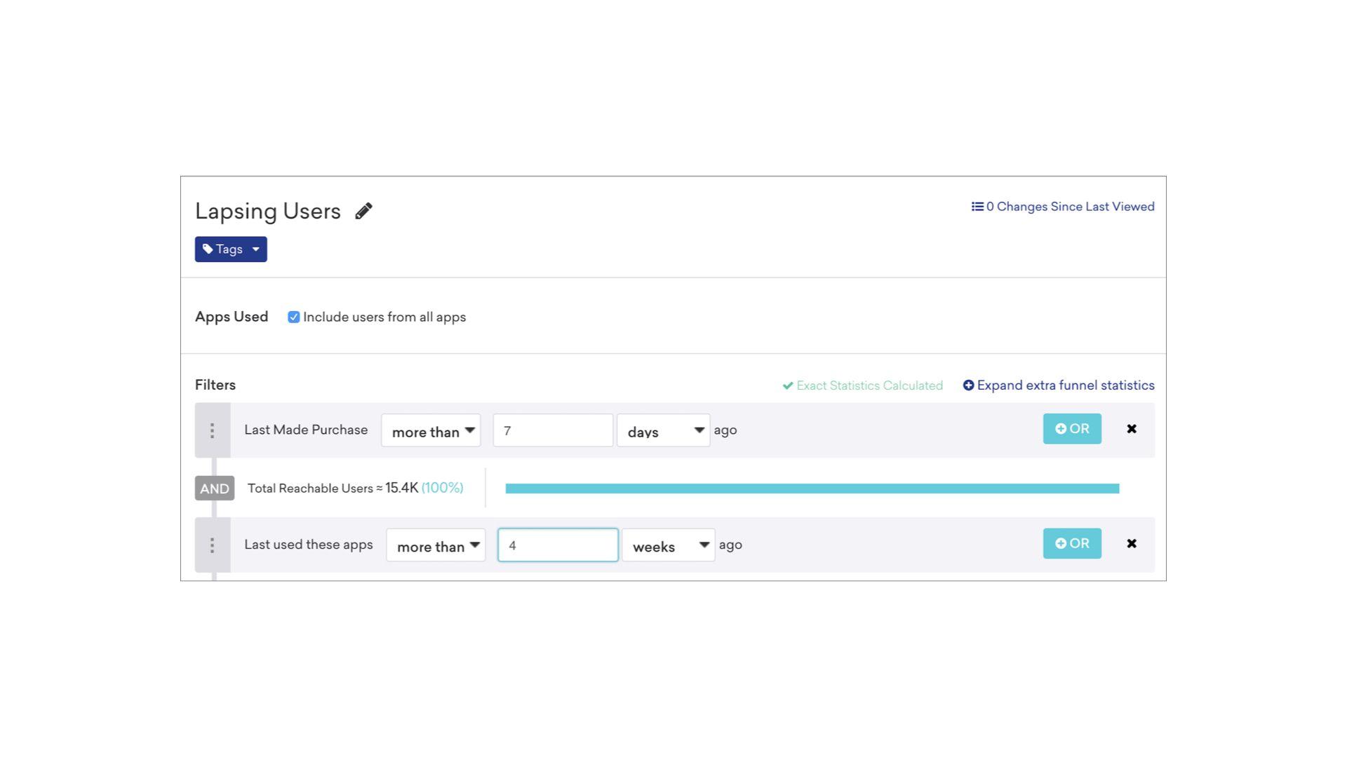 As users log a new session or complete a purchase, they’ll no longer meet the requirement for the Lapsing Users segment and will be removed. These real-time updates ensure you never accidentally send a “We miss you! Enjoy 10% off” message to the wrong audience. Dynamic segmentation, for the win!