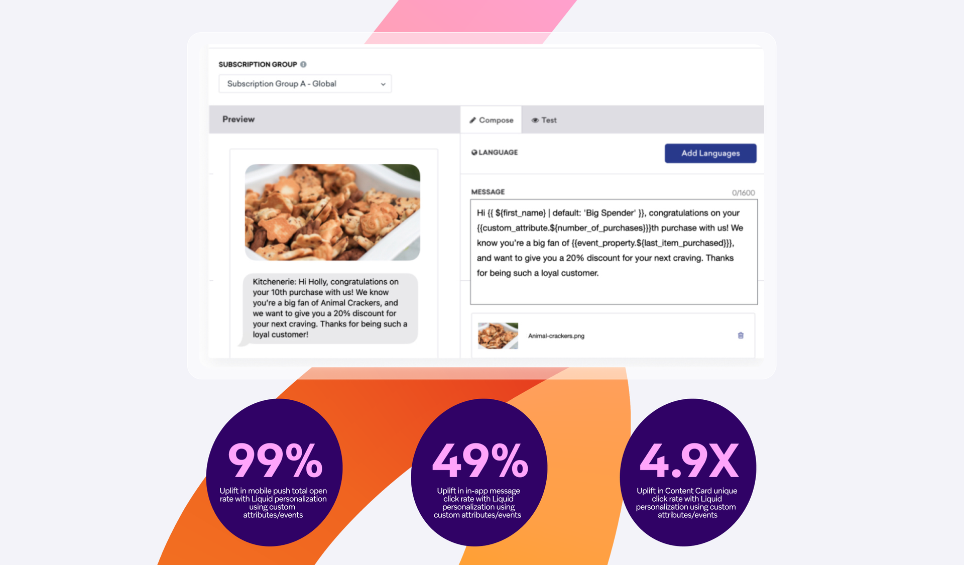 When eCommerce brands are able to customize messages based on user demographics, preferences, interests, behavior, and activity, recipients are more likely to engage and convert. In fact, an analysis of Braze data reveals that personalizing messages can lead to an uplift in conversions by as much as 27%.
