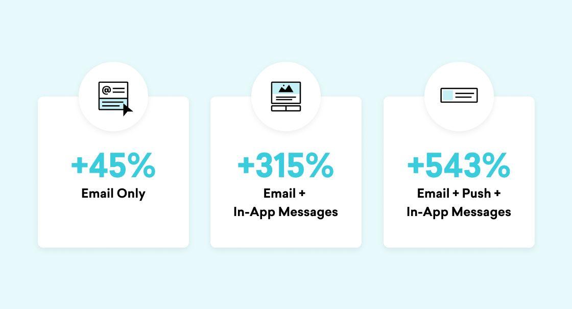 Adding in-app messaging to your email campaign can support a more cohesive, end-to-end customer experience and lead to a 315% increase in engagement. If you go even further and add push notifications as well, this three-channel cross-channel engagement strategy can drive a 543% increase in engagement, making your marketing efforts significantly more effective.