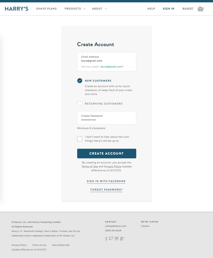 As well as calling out obvious mistakes in their sign up form, Harry’s adheres to Spam Regulation best practices by asking whether their users would like to receive marketing emails.