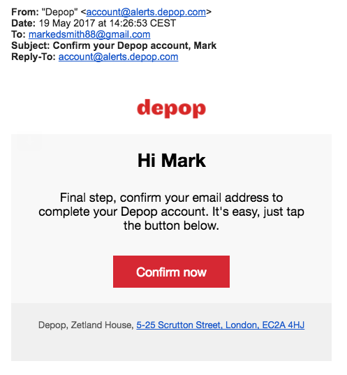 After sign up, the next step is to ask a user to confirm their email address by clicking a link in a confirmation email. Depop ask their customers do this by sending an email out immediately after sign up: