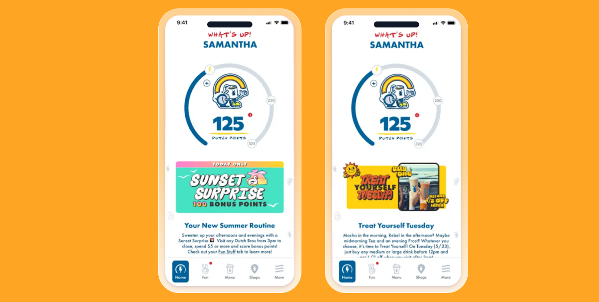 Using Braze Canvas, Dutch Bros built dynamic cross-channel journeys that adapted to individual behaviors. The CRM team used Canvas to send product-specific emails triggered by real-time app actions, like tipping, rewards activity, or purchase history. They also used Braze Catalogs to pull in location-based content and recommendations, personalizing each message with the customer’s name, preferences, and most-visited store.