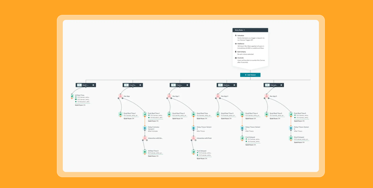 Then, with Braze Canvas, you can turn that plan into a working flow. The drag-and-drop interface makes it easy to build journeys with conditional paths, message variations, and real-time triggers–all without leaving the platform. You can test ideas, adjust logic, and scale what works without rebuilding from scratch. It makes mapping feel manageable and flexible, even for lean teams.