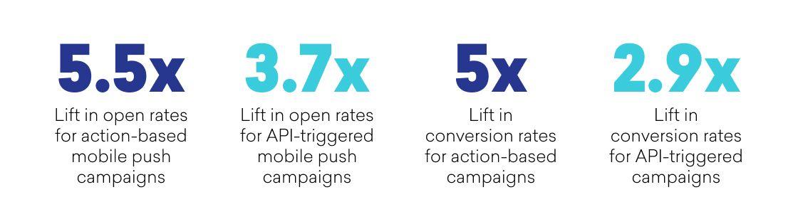 We found that action-based and API-triggered campaigns have higher conversion rates than traditional, scheduled campaigns. Action-based and API-triggered campaigns personalize messaging to: