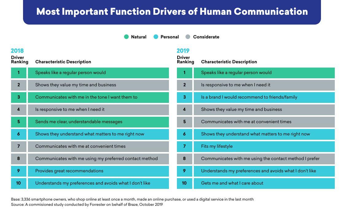 Beyond the emotional factors, Forrester looked at the functional characteristics of the actions brands can take to demonstrate that they can speak to human beings like, well, human beings. These actions fall into three primary categories—natural, considerate, and personal communication: